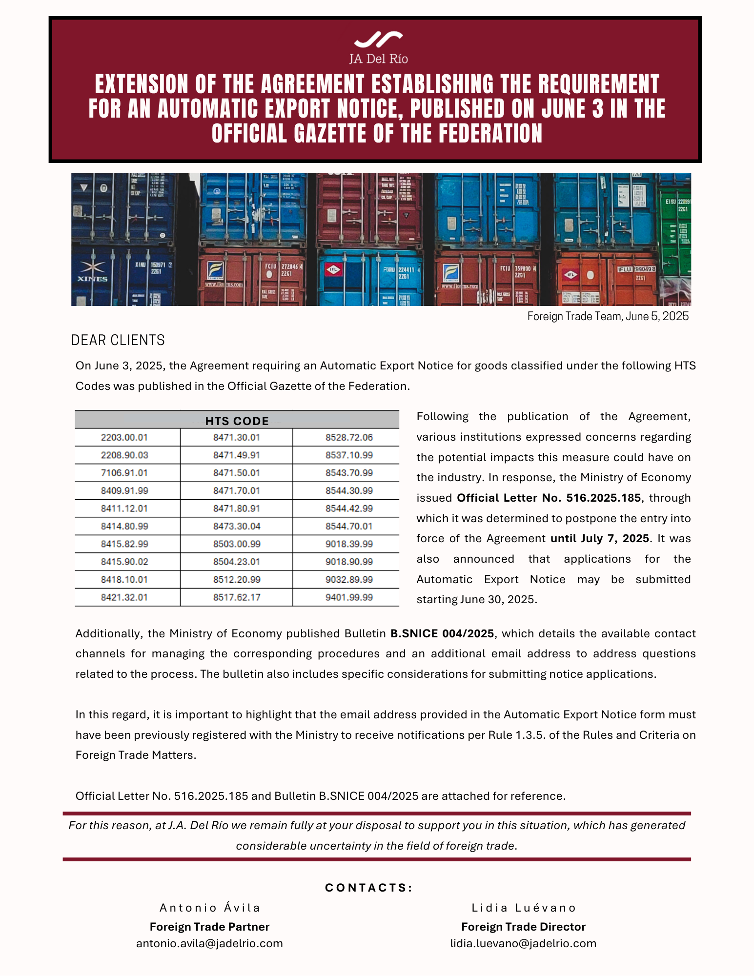 Following the publication of the Agreement, various institutions expressed concerns regarding the potential impacts this measure could have on the industry. In response, the Ministry of Economy issued Official Letter No. 516.2025.185, through which it was determined to postpone the entry into force of the Agreement until July 7, 2025. It was also announced that applications for the Automatic Export Notice may be submitted starting June 30, 2025.